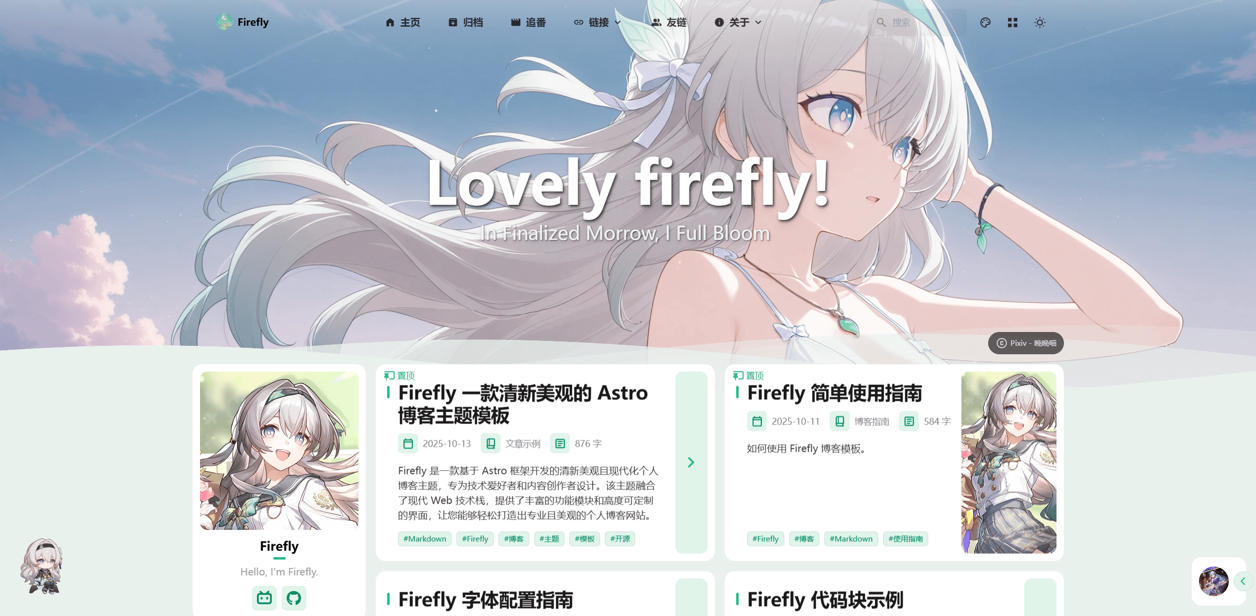 Firefly 是一款基于 Astro 框架开发的清新美观且现代化个人博客主题,专为技术爱好者和内容创作者设计。该主题融合了现代 Web 技术栈,提供了丰富的功能模块和高度可定制的界面,让您能够轻松打造出专业且美观的个人博客网站。